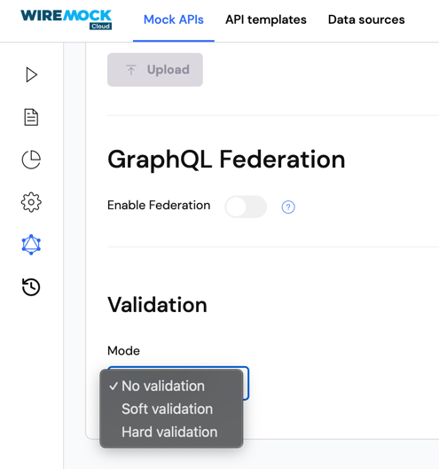 Validation settings can be used to ensure that requests made to your mock API and responses returned by your mock API are compliant with your GraphQL schema, as well as the GraphQL specification. Settings for GraphQL validation can be found on the GraphQL page of your mock API. There are three options for GraphQL validation: no validation (the default), soft validation, and hard validation.